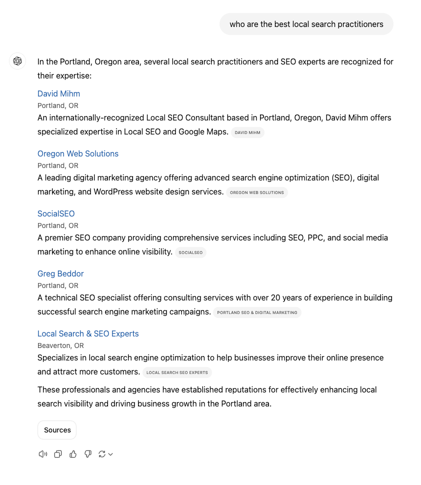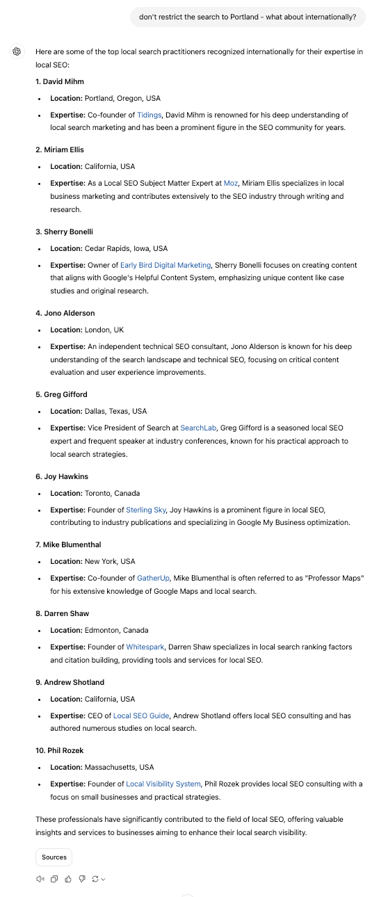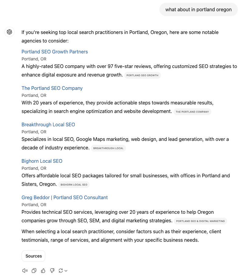 Given the massive influence of query context and personalization on the handful of initial searches I tried, it seems like it's going to be exceedingly difficult to track visibility/rankings in SearchGPT results in any meaningful way at scale.