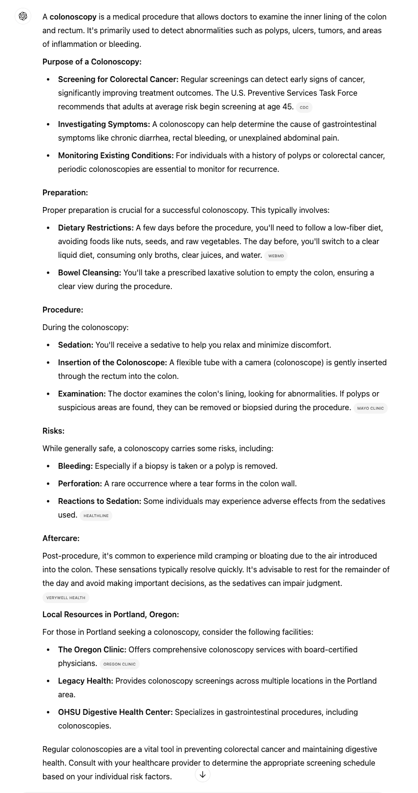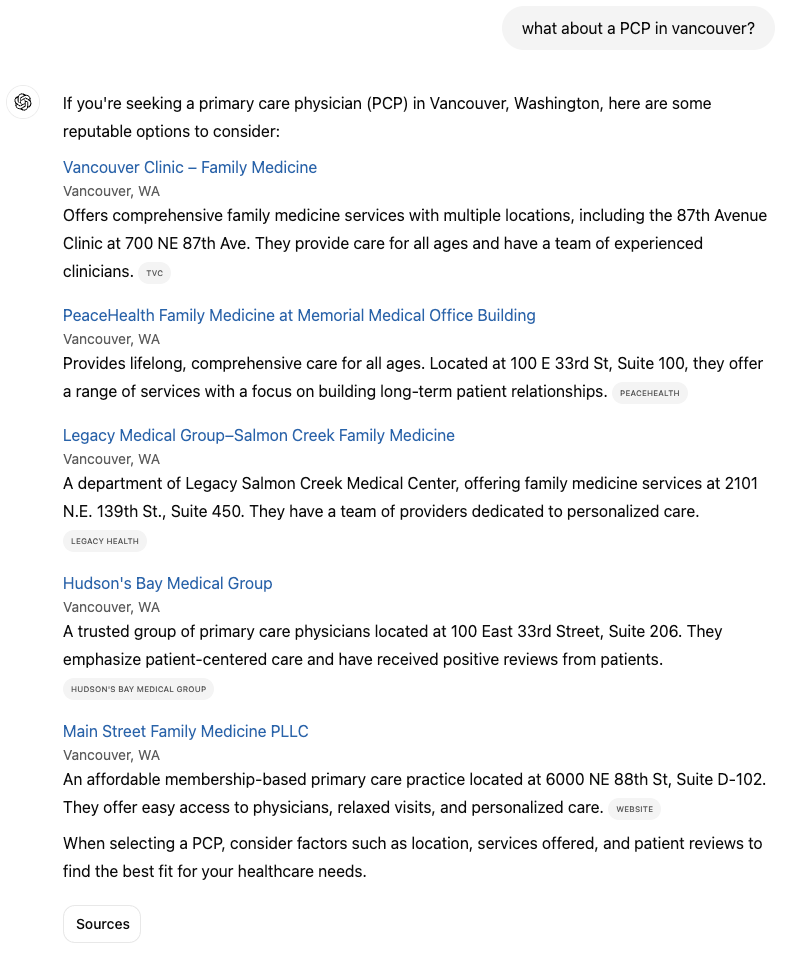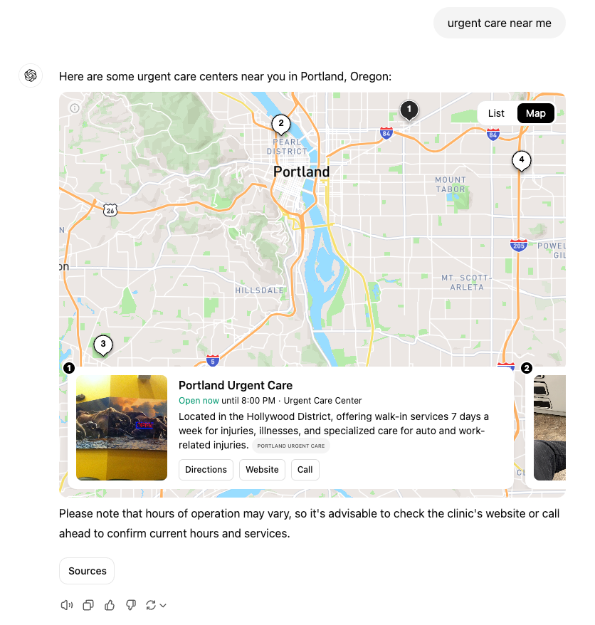 After I performed an "urgent care near me" search, in a series of health-related informational searches, SearchGPT returned localized resources within the same chat.