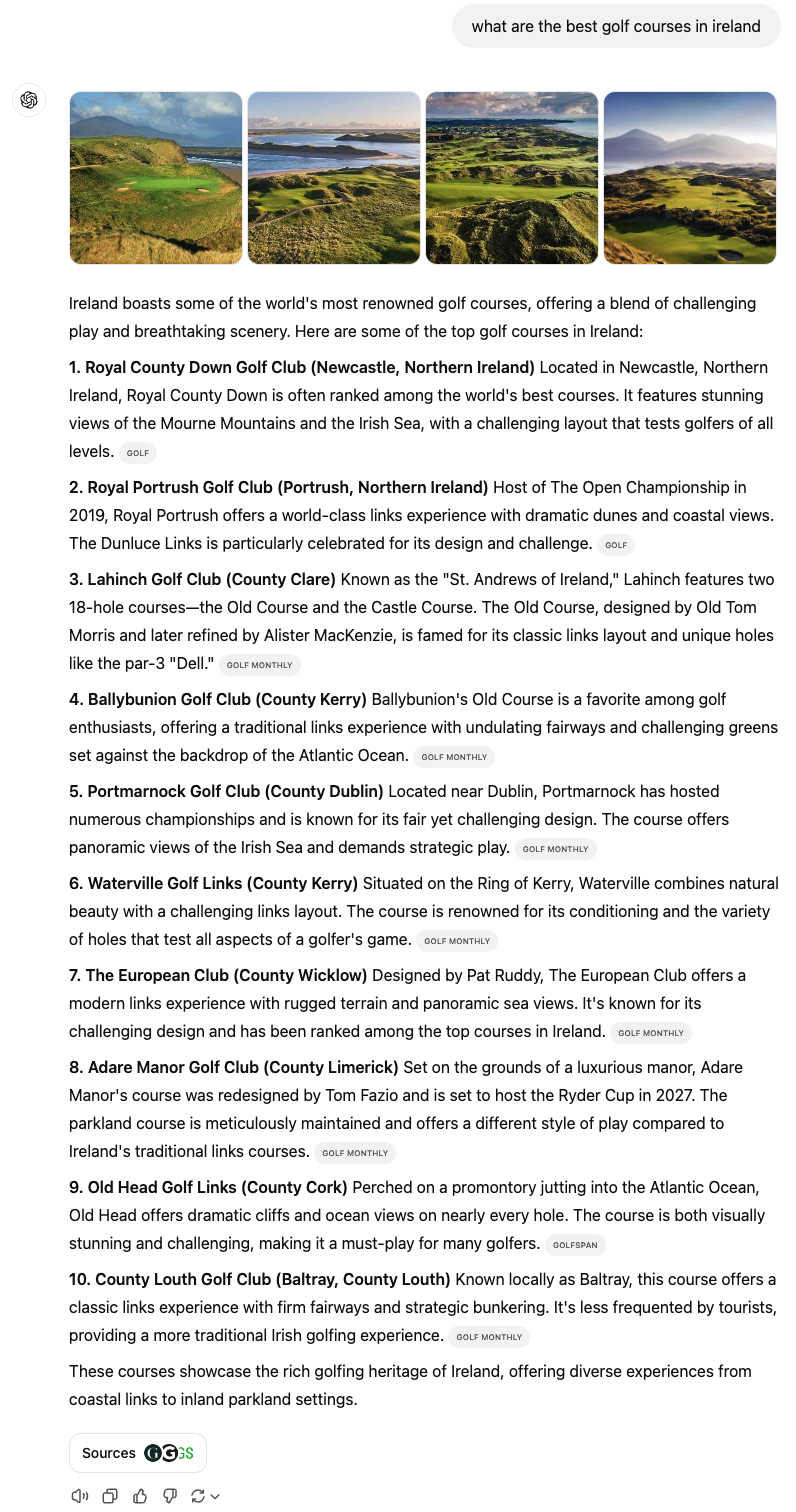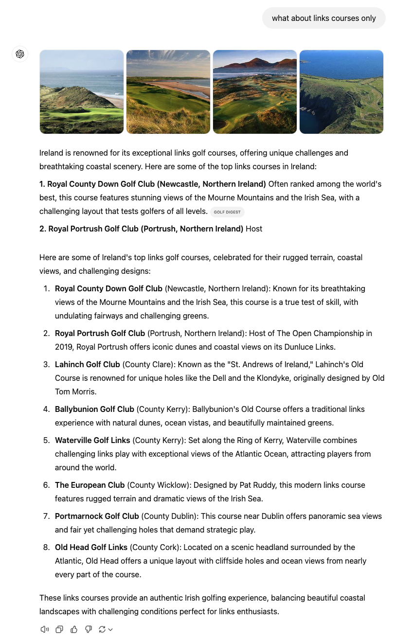 Not only did it basically get the list of Ireland's top golf courses correct (though I'd definitely also include Rosapenna and Narin & Portnoo), but it knew that Adare Manor wasn't a links course and removed it from the list with a very conversational follow-up.