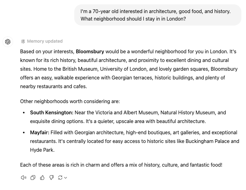 It did just as well with more exploratory, open-ended local searches (e.g., discovering points of interest rather than looking for specific businesses). And it personalized them based on how I described myself.