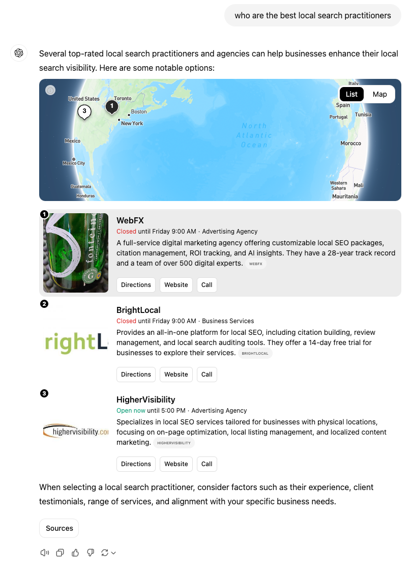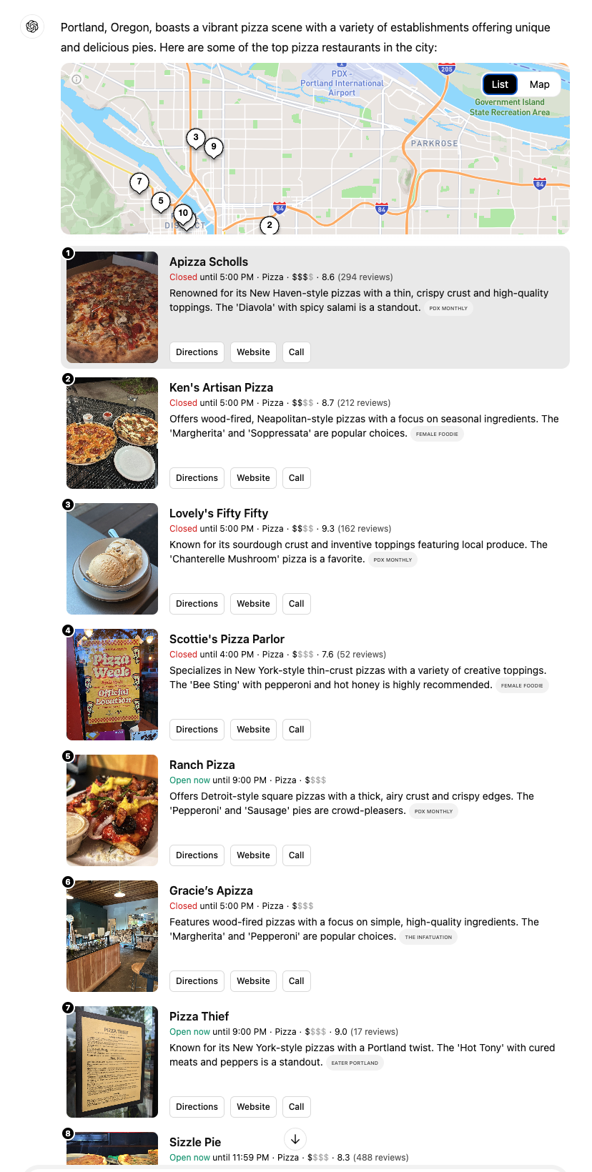 Strangely, sometimes SearchGPT will return a map/list interface as shown above, and other times the UI is something closer to a localized web-based result as shown below, which bizarrely links to Google Maps URLs.