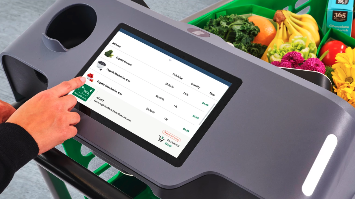 Apple's iBeacon was announced in 2013. It (and similar technologies) promised an "indoor location" revolution. Indoor mapping, in-store notifications, nearby marketing, and many other creative use cases, were envisioned. Millions poured into startups and I helped found a conference based on what we assumed would become a major new channel. It didn't happen. Indoor location morphed into location intelligence and store-visitation measurement, which is powerful – and privacy challenged. Now Amazon's Dash Cart offers a potential new channel for in-store grocery/CPG marketing. One of several smart shopping carts, it's being used at Amazon Fresh stores. The 2.0 version will be tested in Whole Foods. Among other features, Amazon says: "We’ve evolved the carts’ ability to more precisely determine where the cart is in the store to better show nearby products and deals." As you can see from the image, there's a large display for those messages.